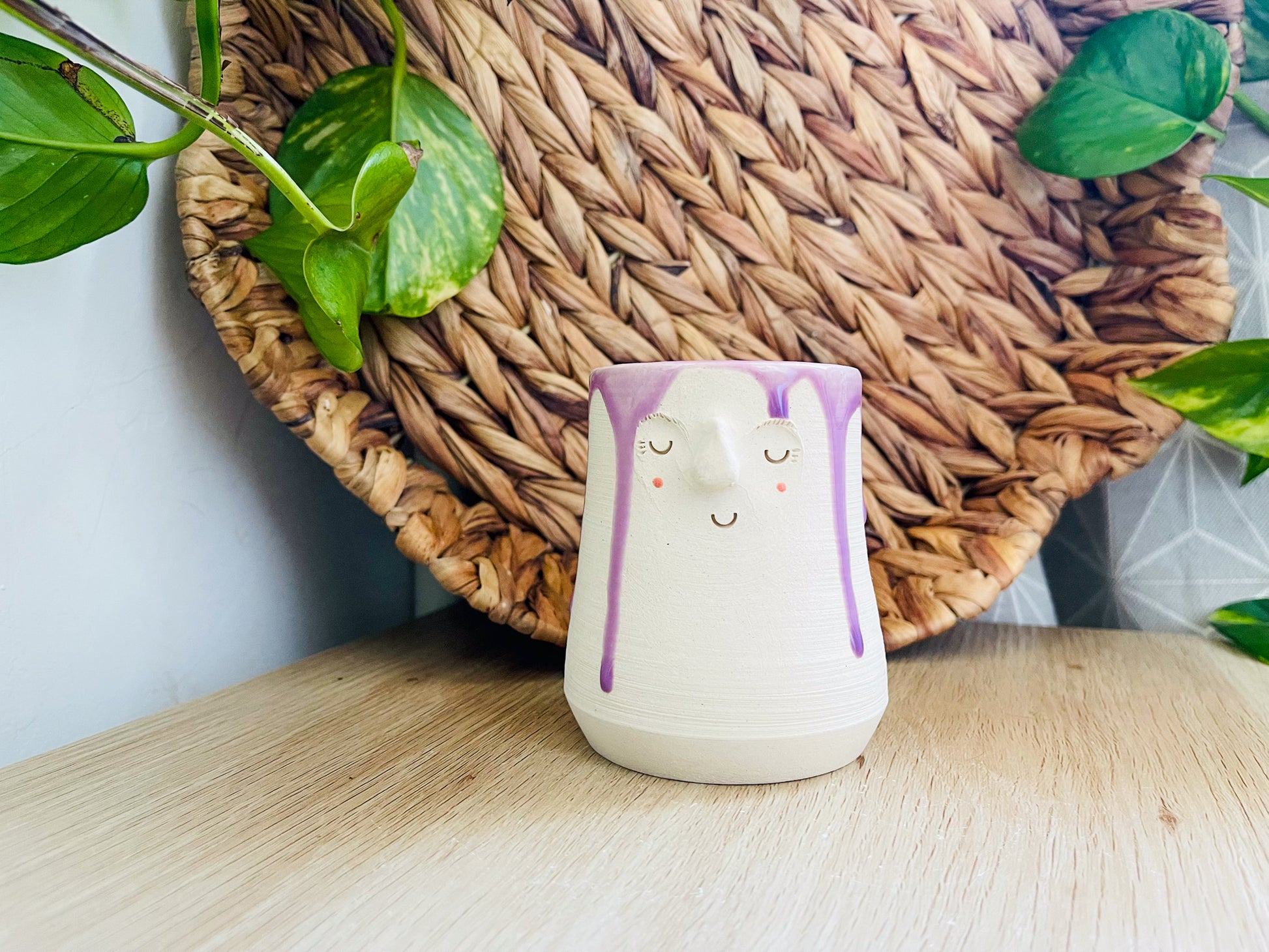 a handthrown pot, made on the potters wheel with white clay. this cutie has been decorated with a glossy bright purple glaze that covers the inside & drips around the outside.