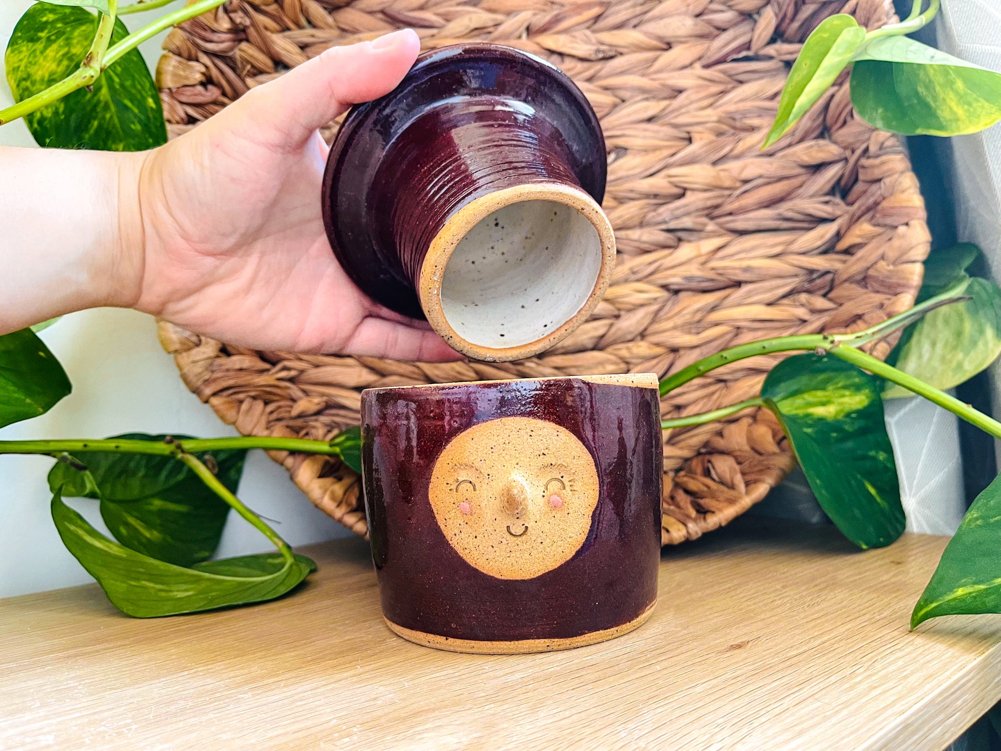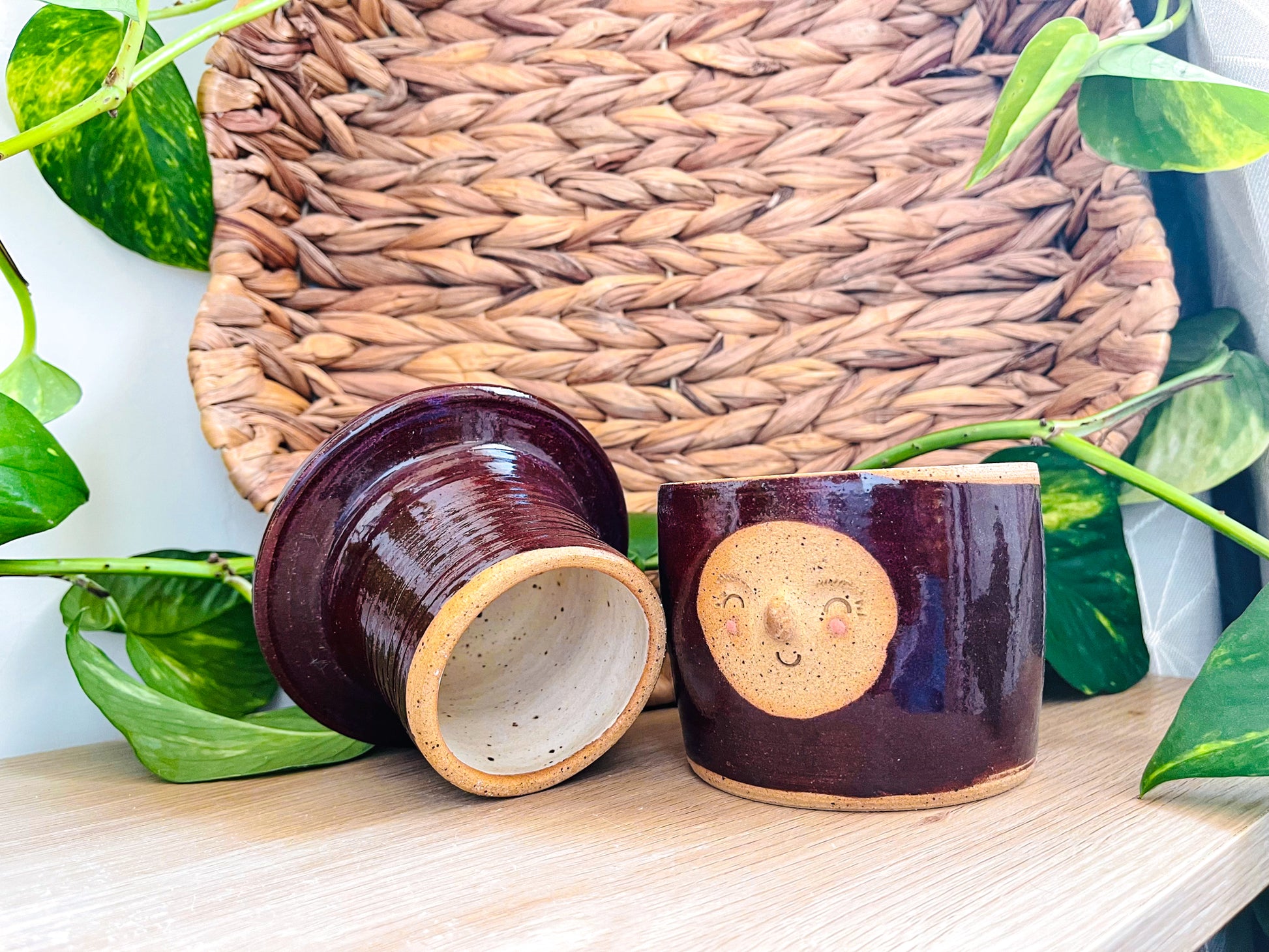 a handthrown two-piece butter keeper, made with a sandy stoneware clay. this piece has been decorated with a dark orange glaze all over apart from the inside of the butter bell, which has been covered with a satin-effect speckled white glaze. its sweet little face peeks out from an unglazed heart shape!