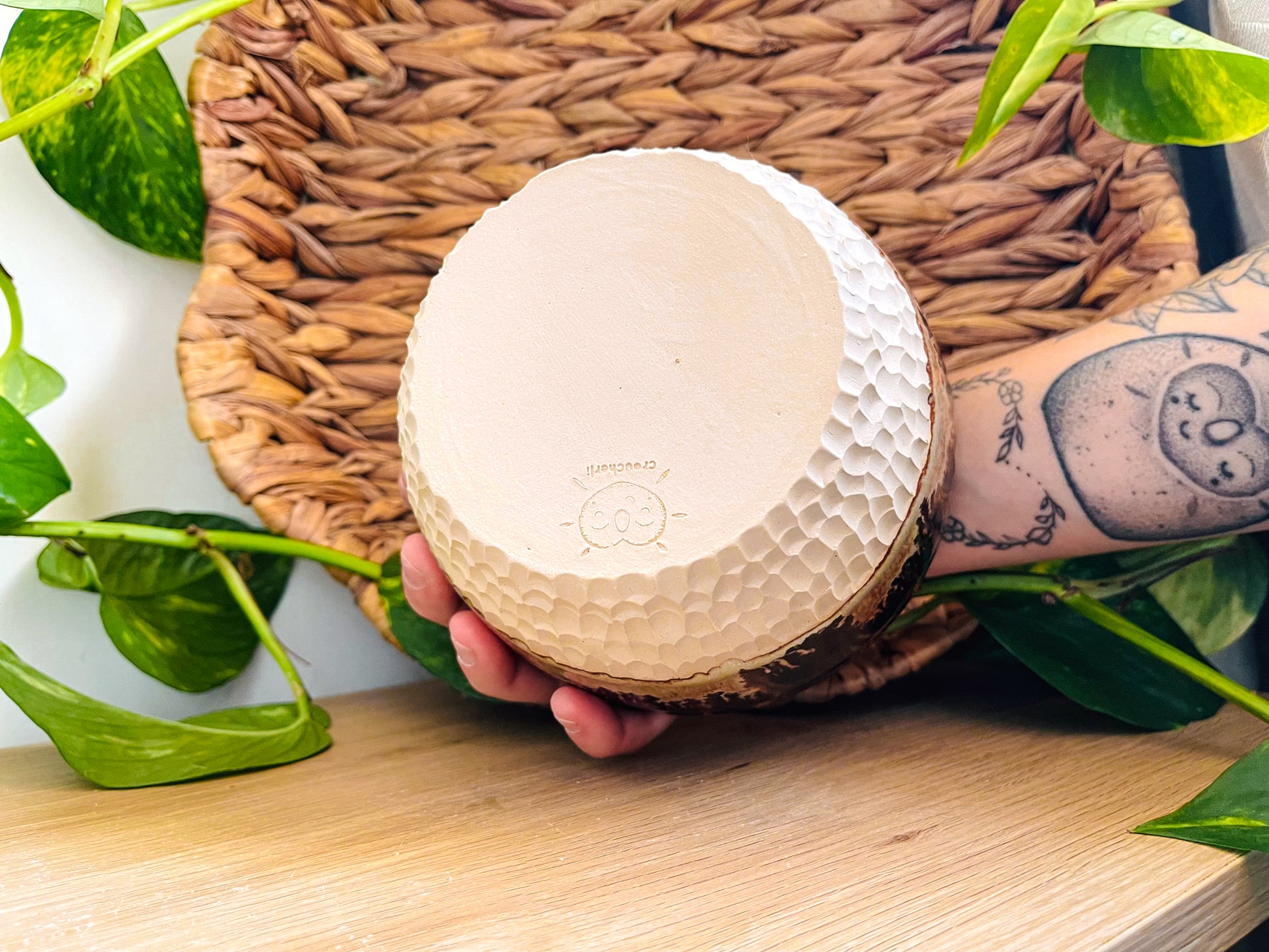 a handthrown bowl, made with white stoneware clay - with the clay cutaway in layers at the bottom to give a tactile textured effect around the bottom half. it has been decorated with layered glazes that resembles a tigers' eye gemstone, breaking beautifully over the spiral on the inside of the bowl.