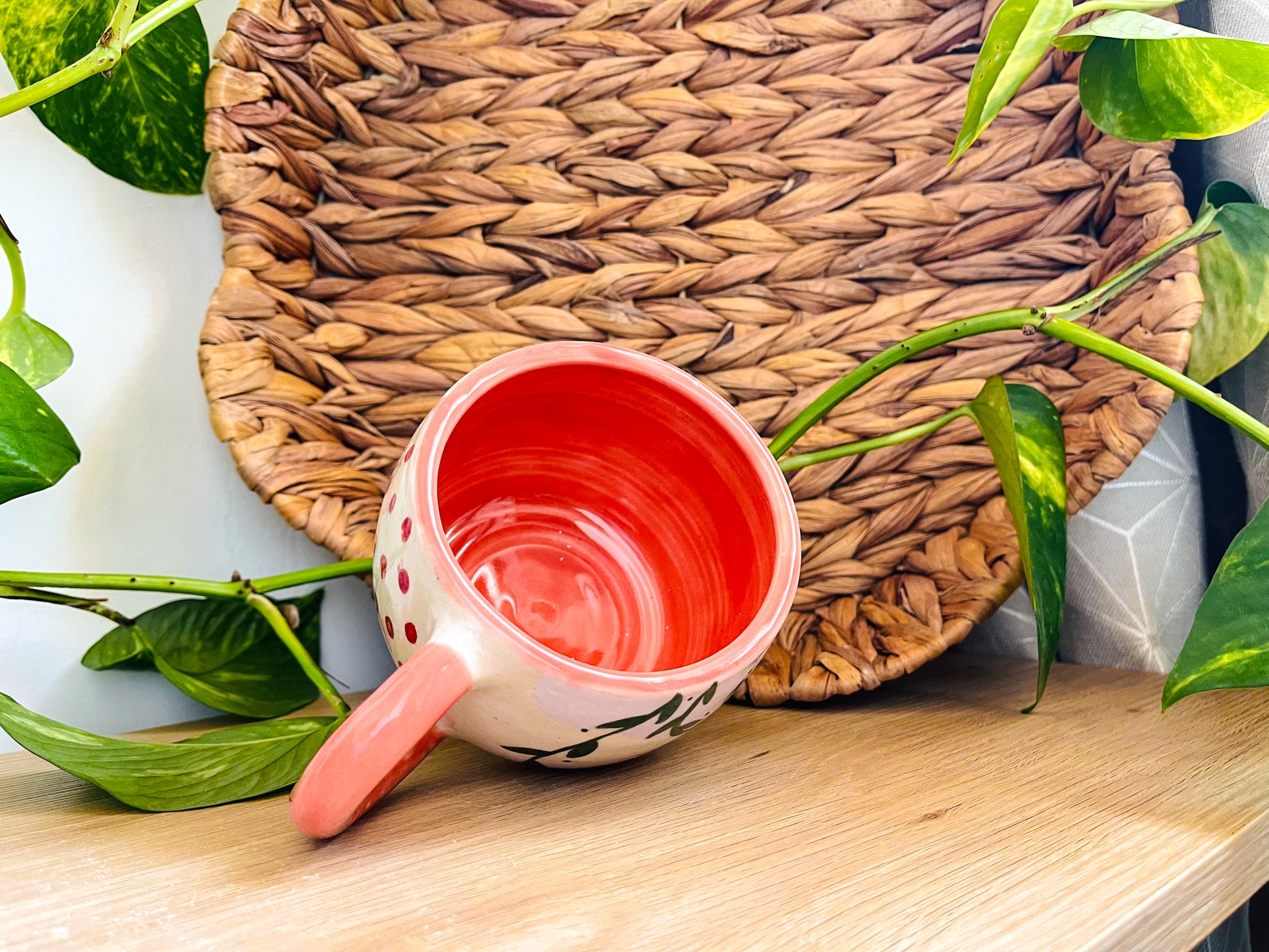 this mug has been decorated with handpainted colourful doodles, which have been covered with a clear glossy glaze. the handle & inside have been overed in a glossy pink glaze.