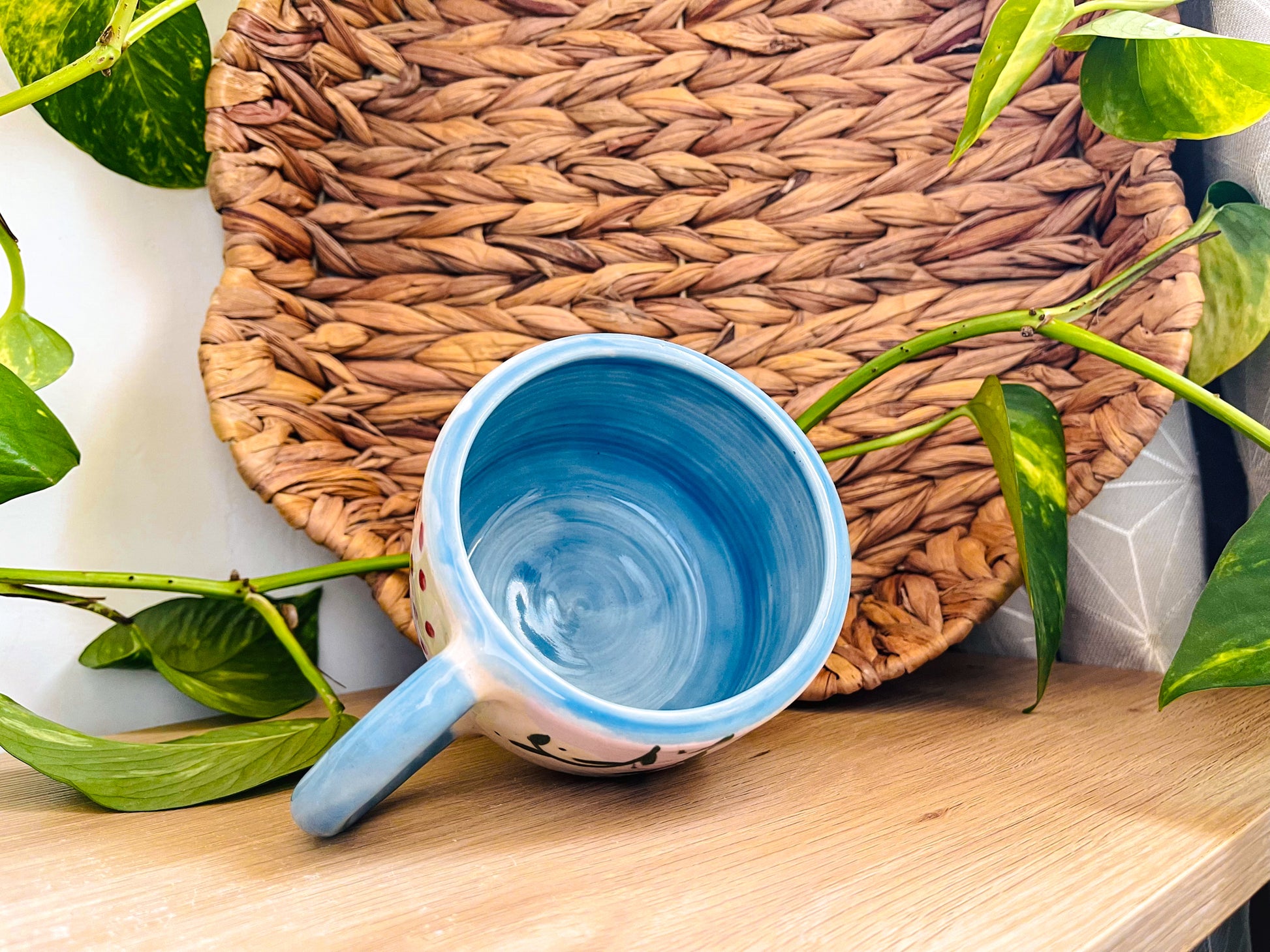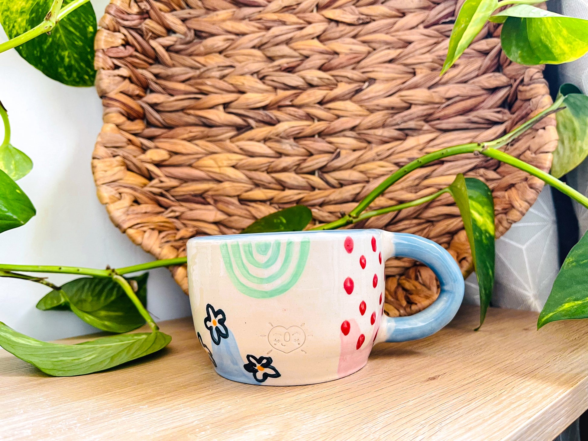 this mug has been decorated with handpainted colourful doodles, which have been covered with a clear glossy glaze. the handle & inside have been overed in a glossy light blue glaze.