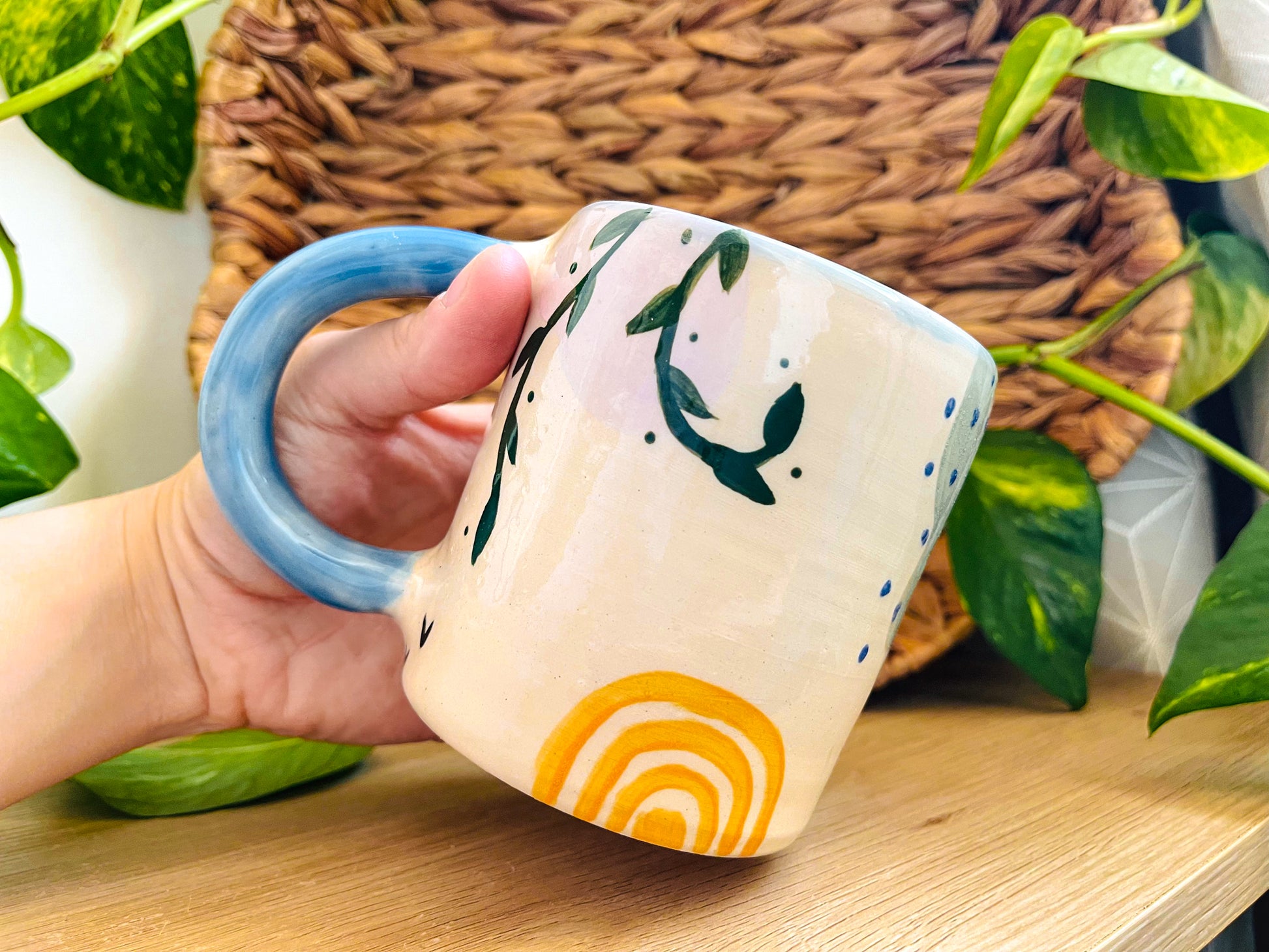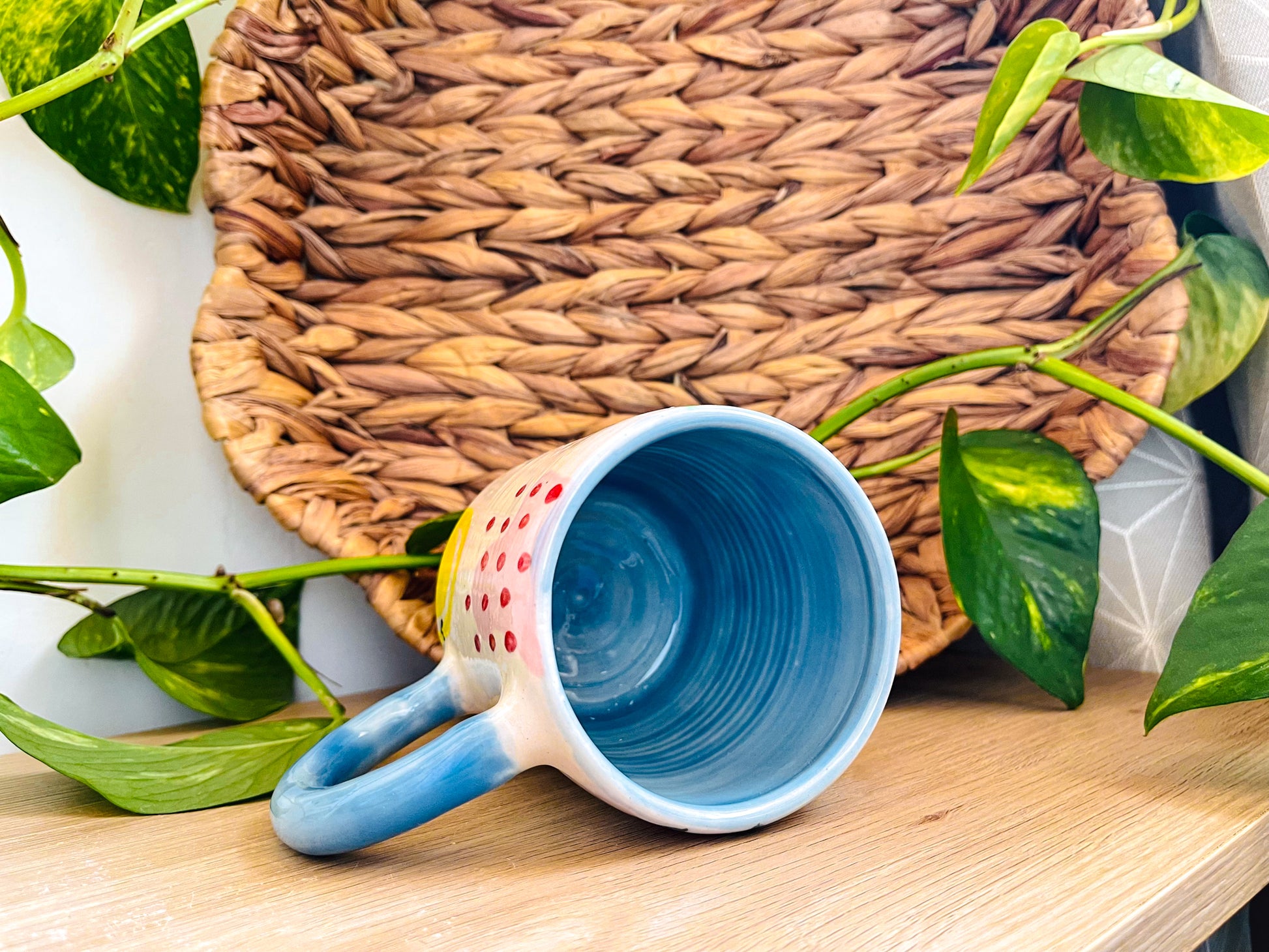 this mug has been decorated with handpainted colourful doodles, which have been covered with a clear glossy glaze. the handle & inside have been overed in a glossy light blue glaze.