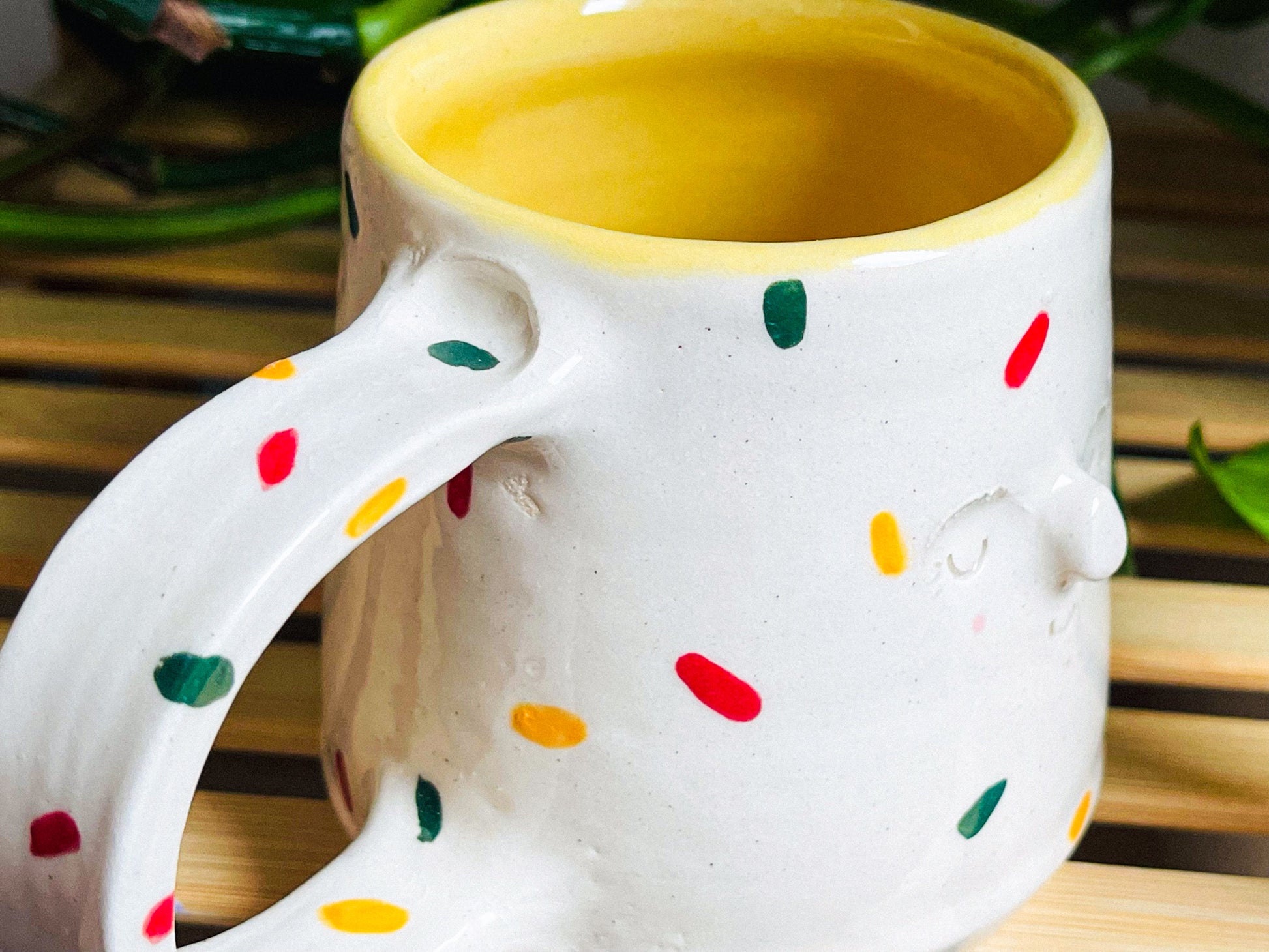 this mug has been decorated with handpainted red, green & yellow confetti pieces on the outside & a glossy yelllow glaze on the inside.