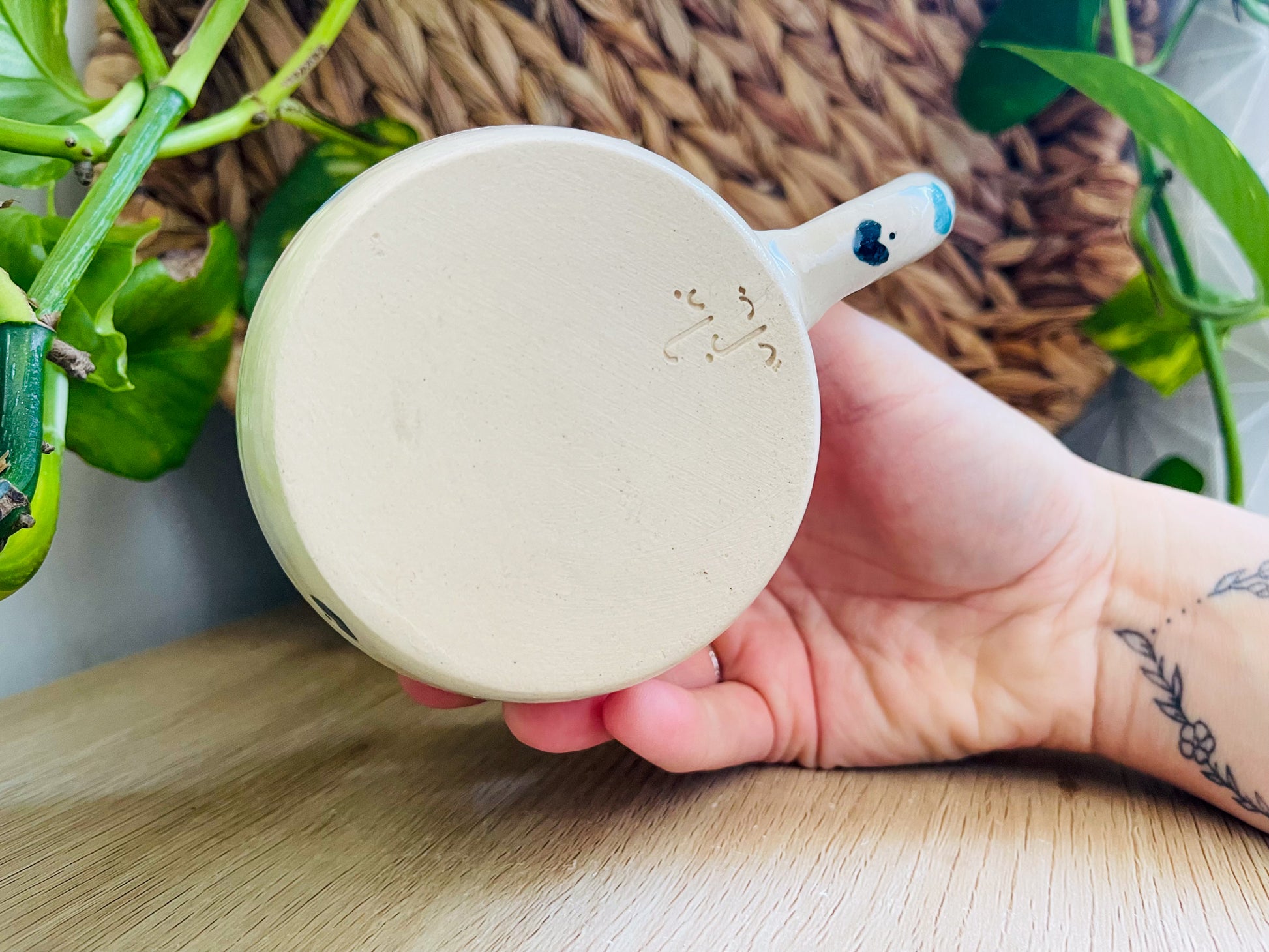 a handthrown mug with a rounded handle, made from white stoneware clay. both have been decorated with little handpainted hearts, & covered on the inside with a glossy dark blue glaze.