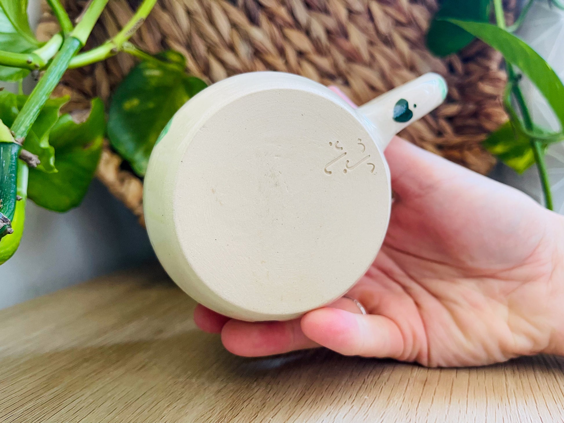 a handthrown mug with a rounded handle, made from white stoneware clay. both have been decorated with little handpainted hearts, & covered on the inside with a glossy dark green glaze.