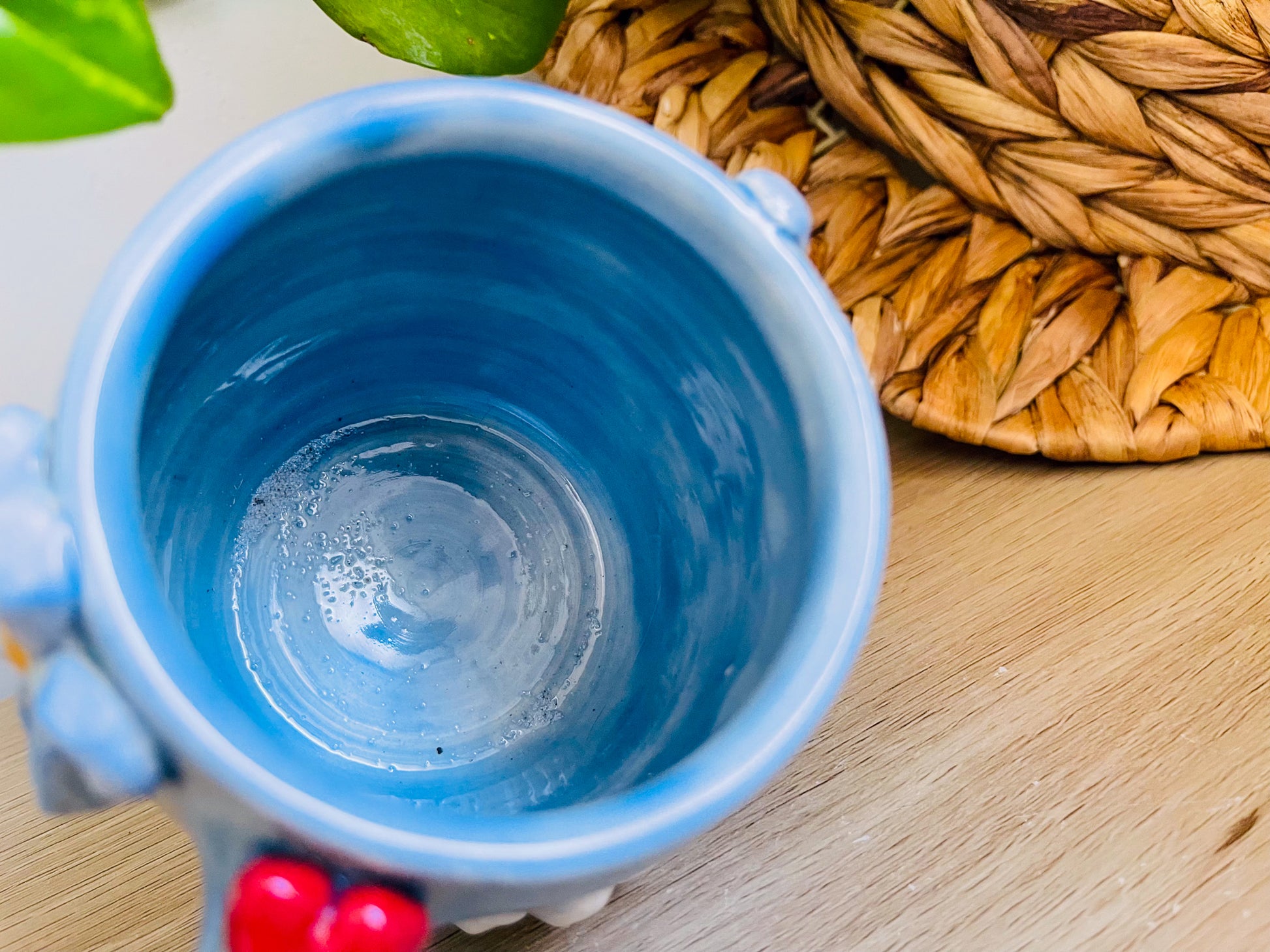 this cutie has a small amount of debris has been sealed into the inside bottom. i would advise it is used as a plant pot or decorative item.