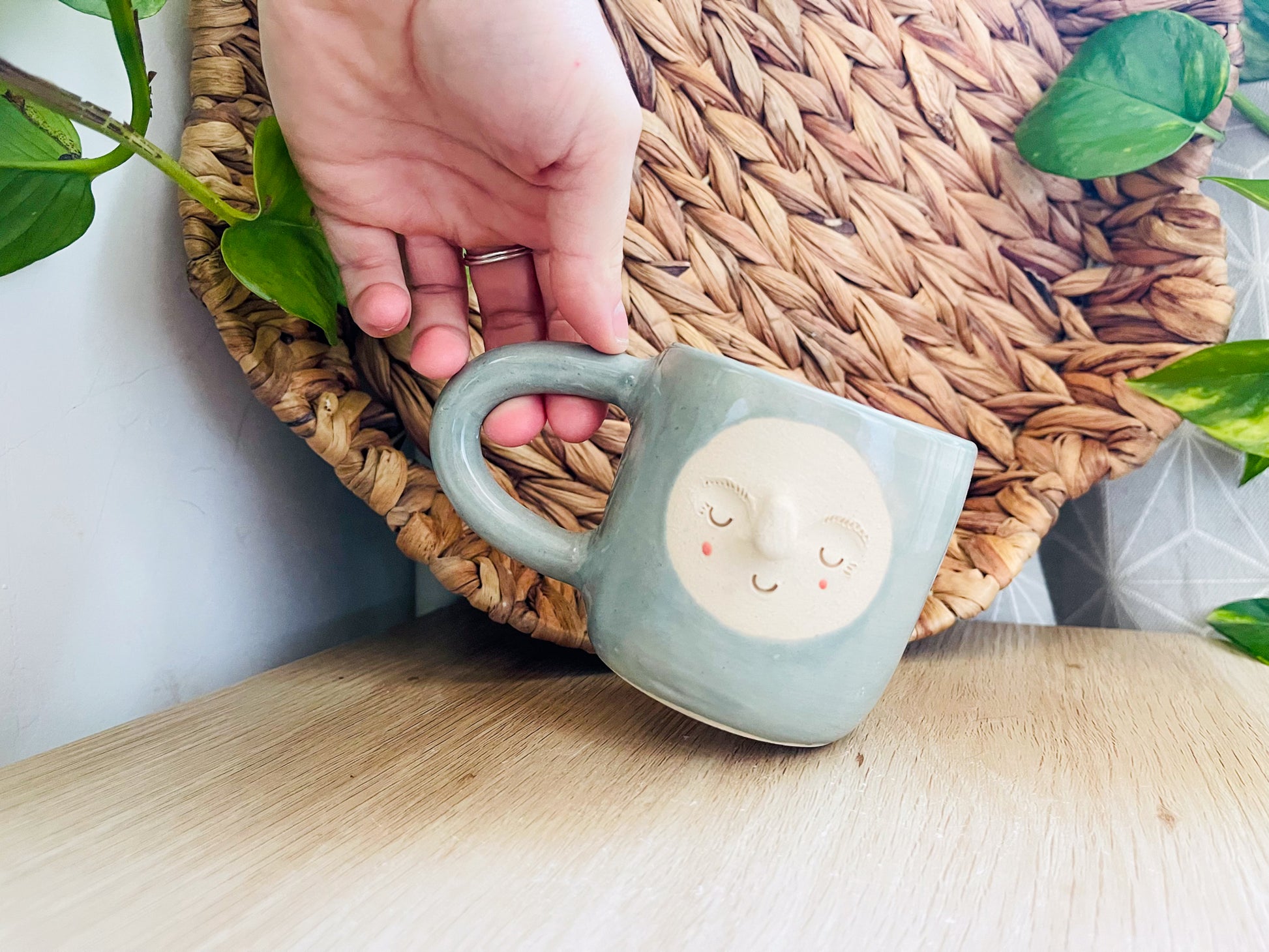 a little handthrown mug with a rounded handle, made on the potters wheel with white clay. this cutie has been decorated with a glossy pale blue glaze, and its sleepy little face peeks out from an unglazed full moon shape.