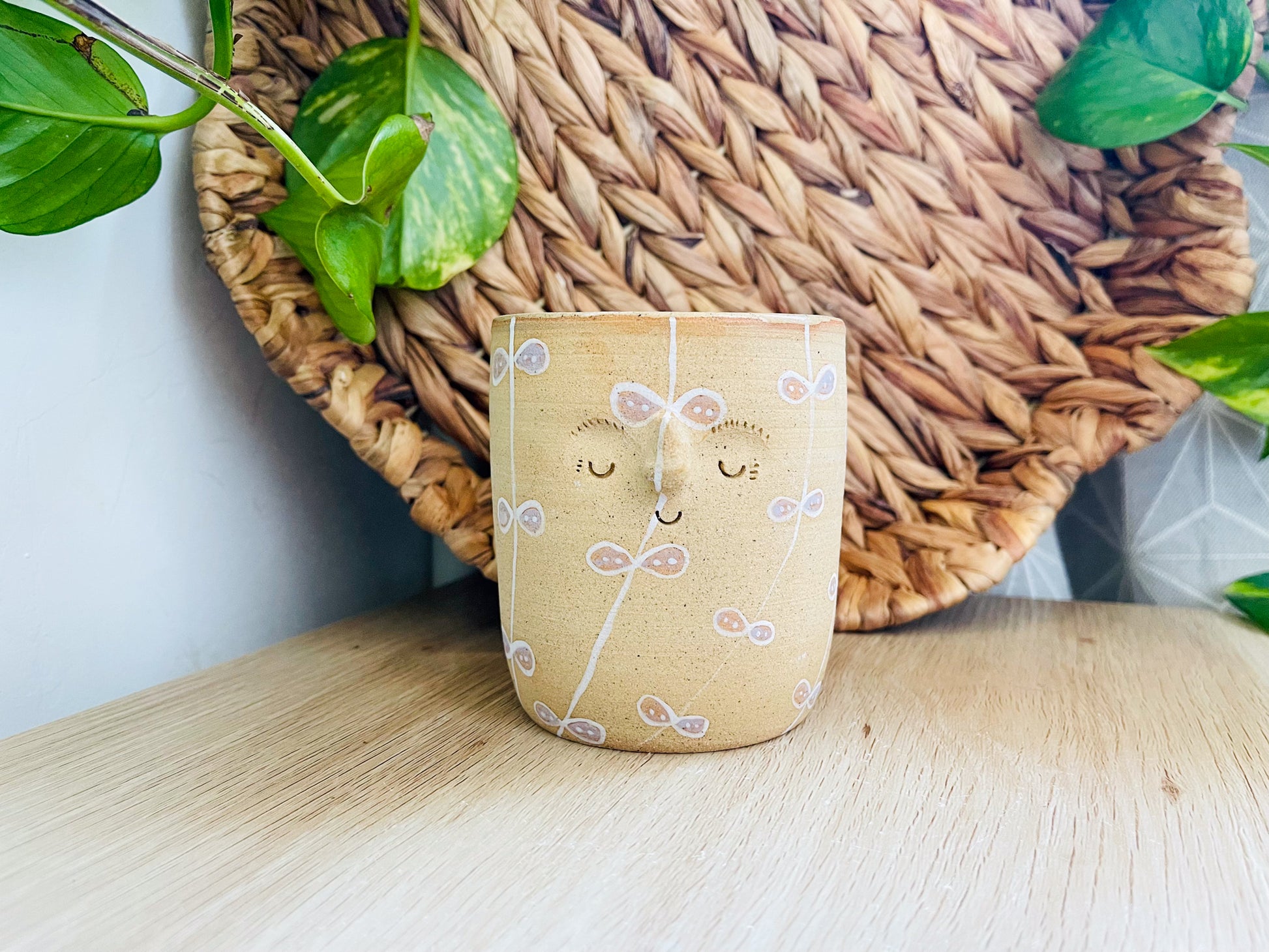 a handthrown pot, made on the potters wheel with sandy clay. this cutie has been decorated with a handpainted bow pattern on the outside (and one on the inside! and covered with a clear glaze on the inside.