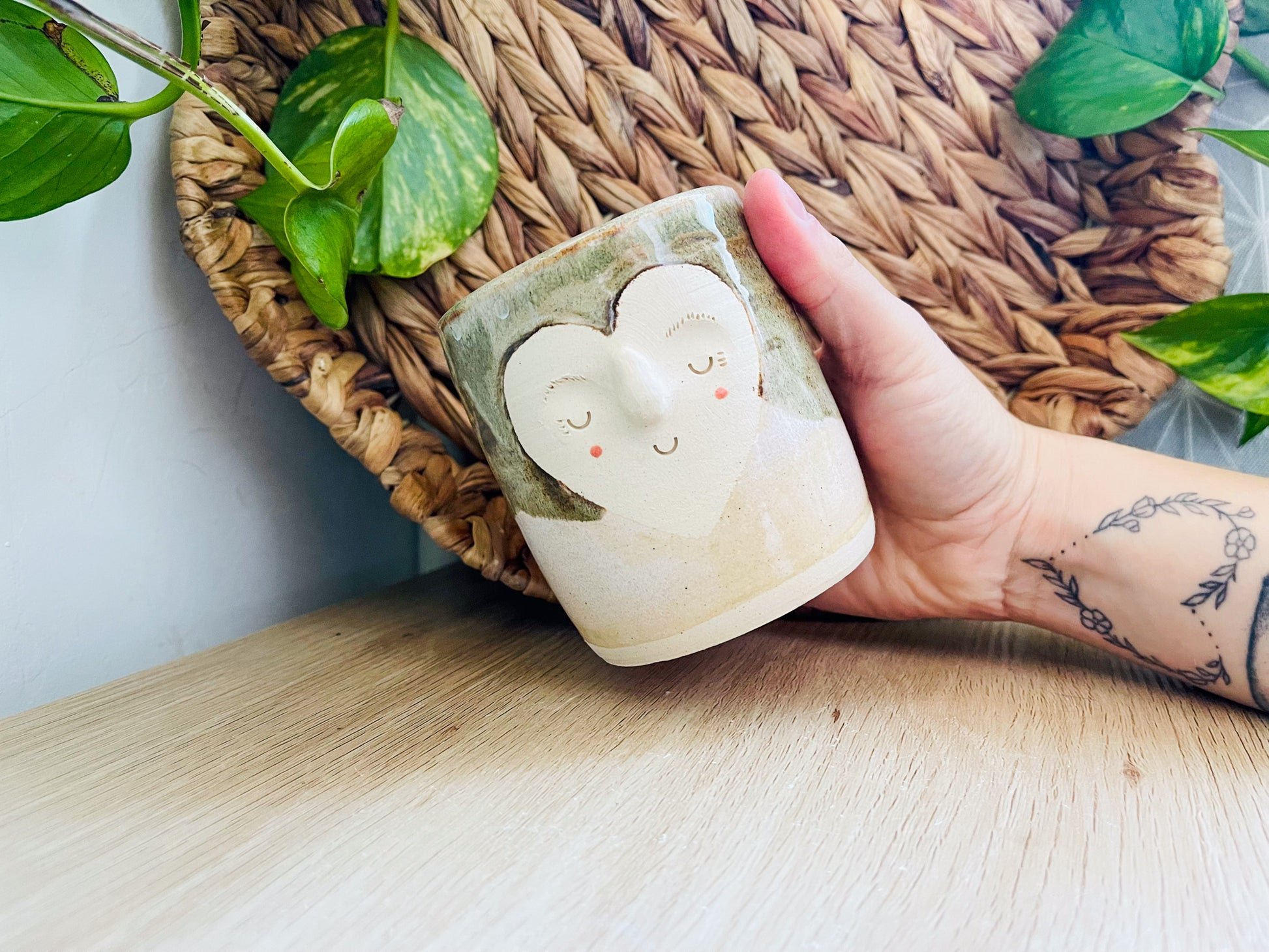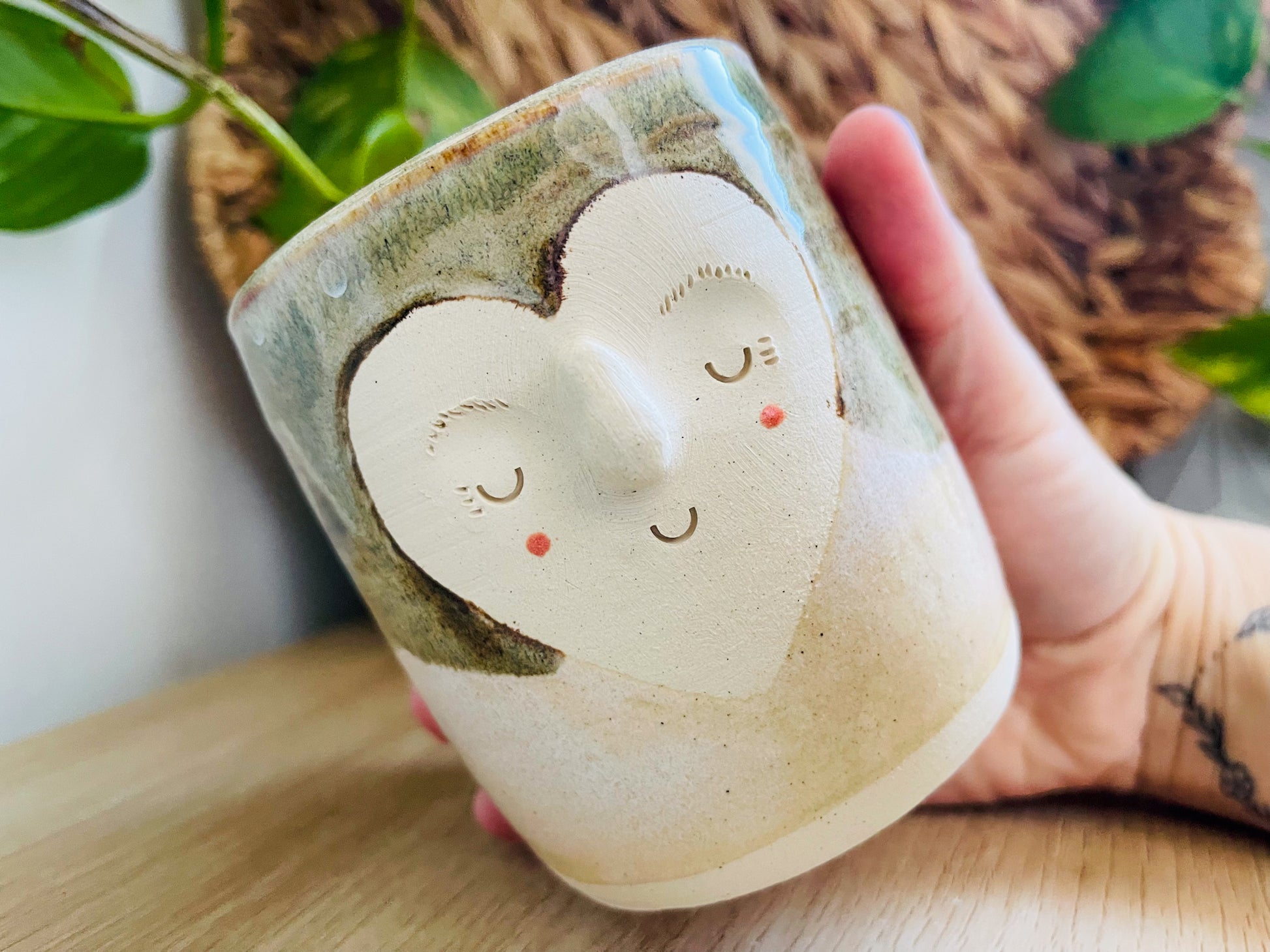 a handthrown pot, made on the potters wheel with white clay. this cutie has been decorated with a wavy split of a sandy[coloured glaze on the bottom & a variegated brown glaze on the top. the pot's sleepy little face peeks out from an unglazed heart shape.