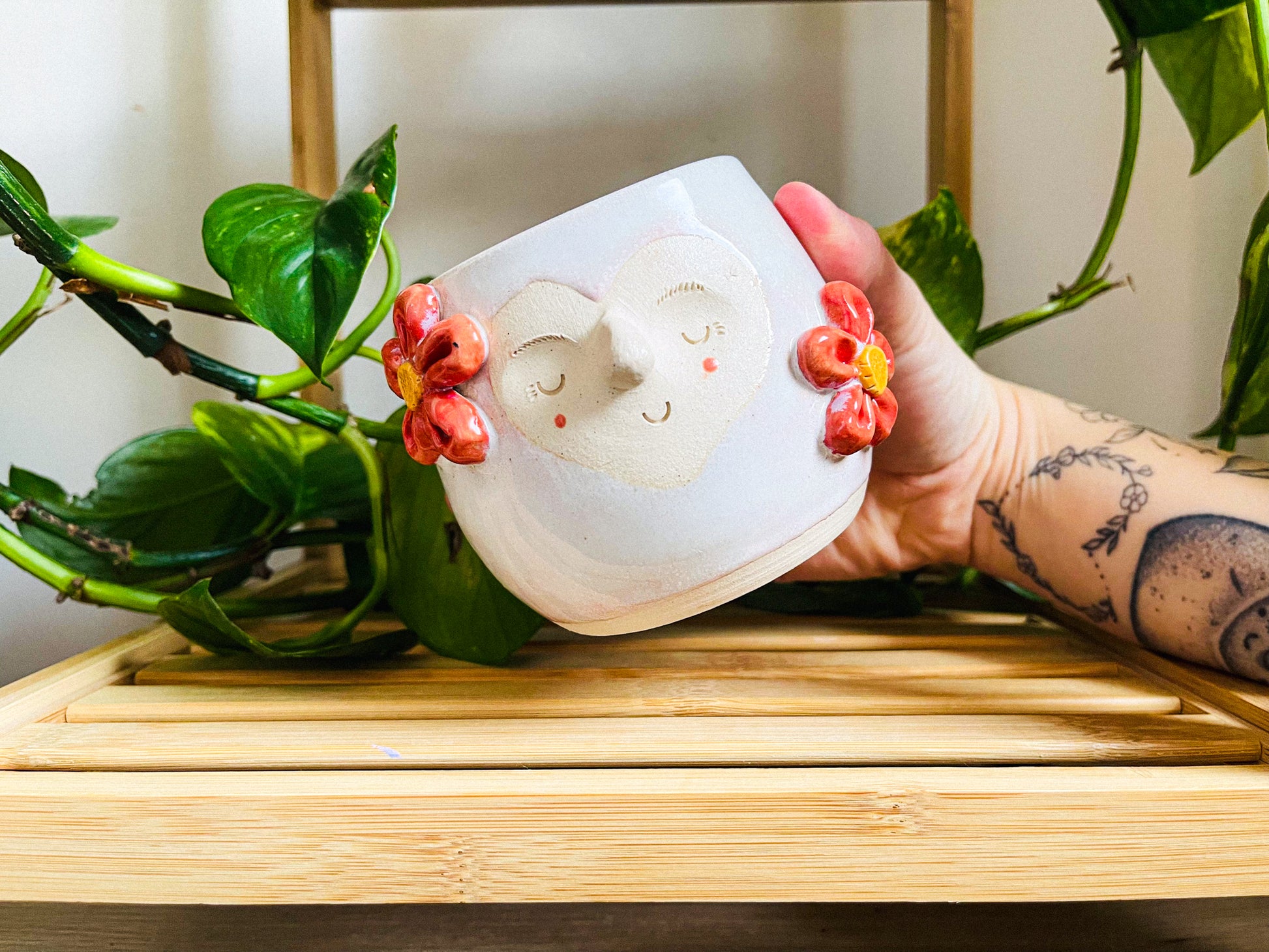 a handthrown pot, made on the potters wheel with white clay - decorated with handsculpted, handpainted flowers & a sweet little smiling face that peeks out from an unglazed heart shape.