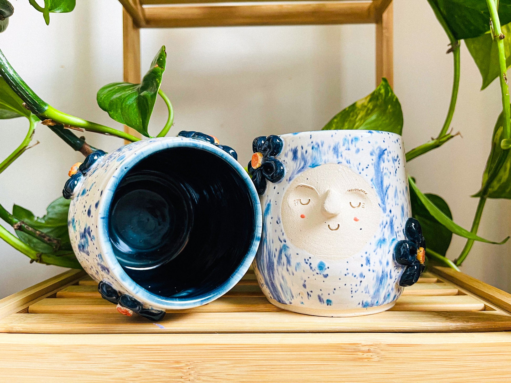 a handthrown pot, made on the potters wheel with white clay - decorated with handsculpted, handpainted flowers & a sweet little smiling face that peeks out from an unglazed full moon shape.