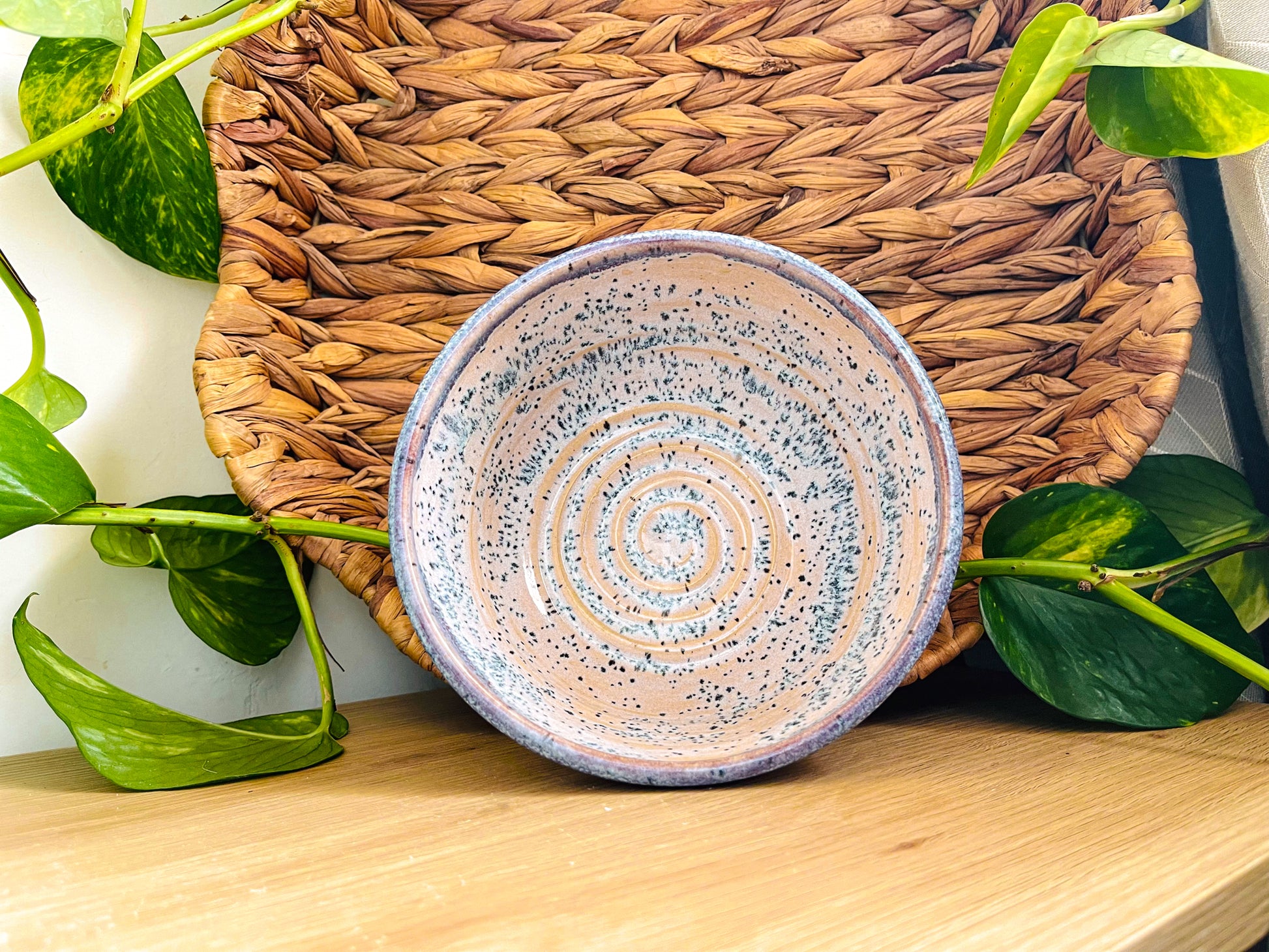 a handthrown bowl, made with white stoneware clay - with the clay cutaway in layers at the bottom to give a tactile textured effect around the bottom half. it has been decorated with a speckled pink glaze that breaks beautifully over the spiral on the inside of the bowl, and a variegated purple glaze around the rim of the bowl.