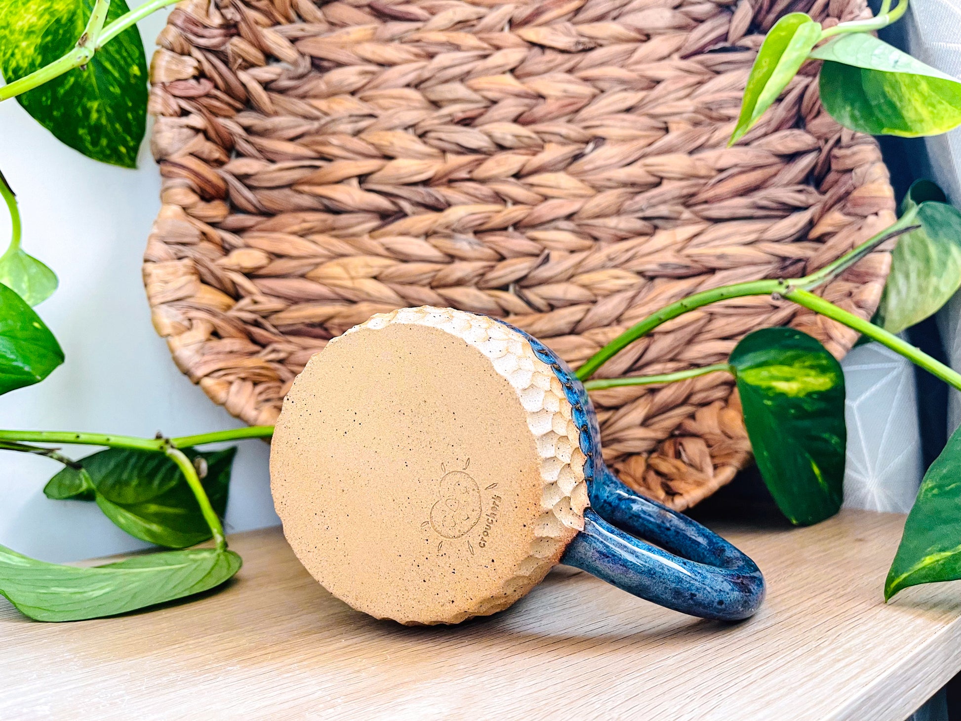 a handthrown mug, made with white stoneware clay - with the clay cutaway in layers at the bottom to give a tactile textured effect around the bottom half. it has been decorated with a dappled dark blue glaze, breaking beautifully over the curve of the mug & down towards the texture.