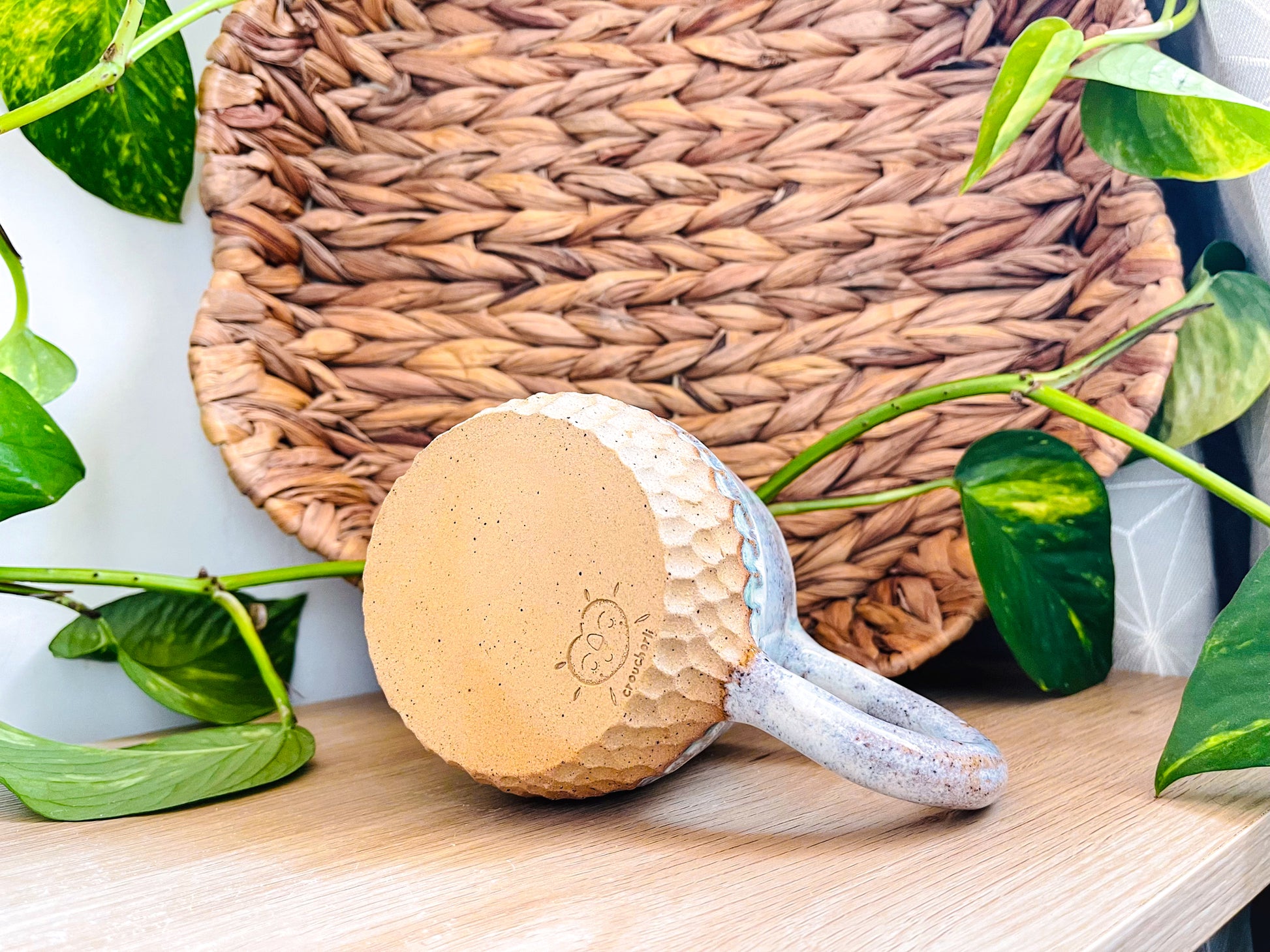 a handthrown mug, made with white stoneware clay - with the clay cutaway in layers at the bottom to give a tactile textured effect around the bottom half. it has been decorated with layers of glazes that give a fresh hit-of-mint colour, breaking beautifully over the curve of the mug & down towards the texture.