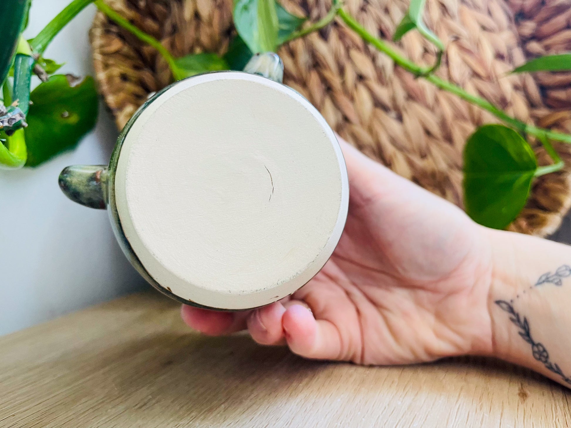 old stock. this cup has a hairline surface crack on the base - it's a cosmetic flaw, so the cup is still functional!