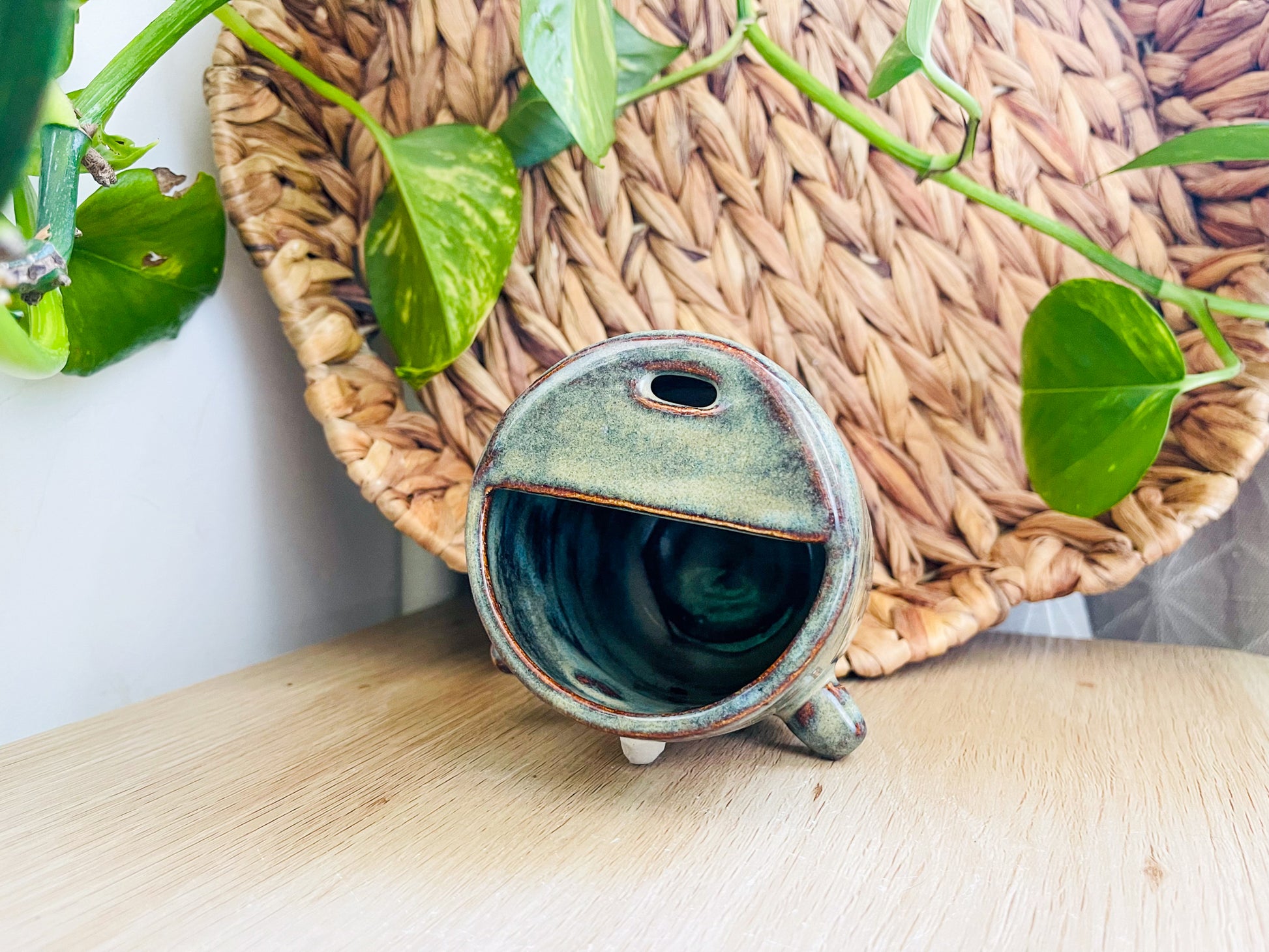 a handthrown cup & a semicircle slab join forces to create the perfect little travel companion. with a sip hole to drink your favourite beverage on the move, and space to scrub it clean once you’re done.