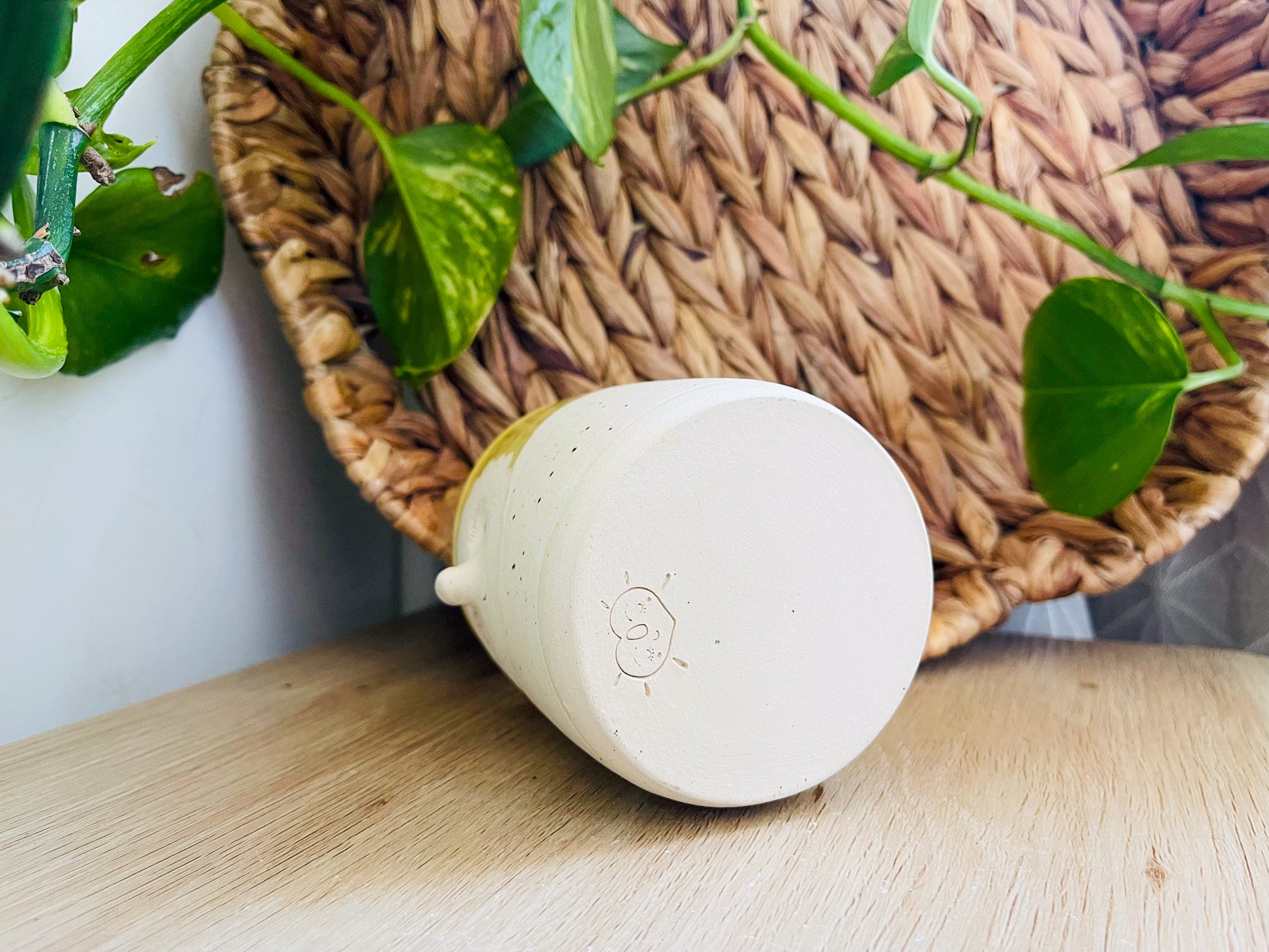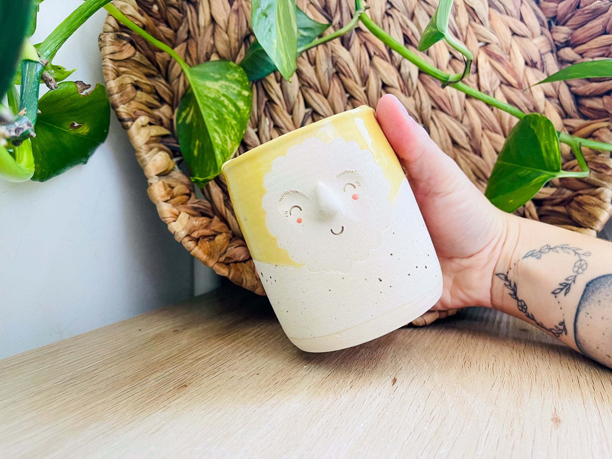 this one has been made with white clay & decorated with a split of speckled white & glossy yellow glazes. its happy little face and rosy cheeks peek out from an unglazed flower shape.