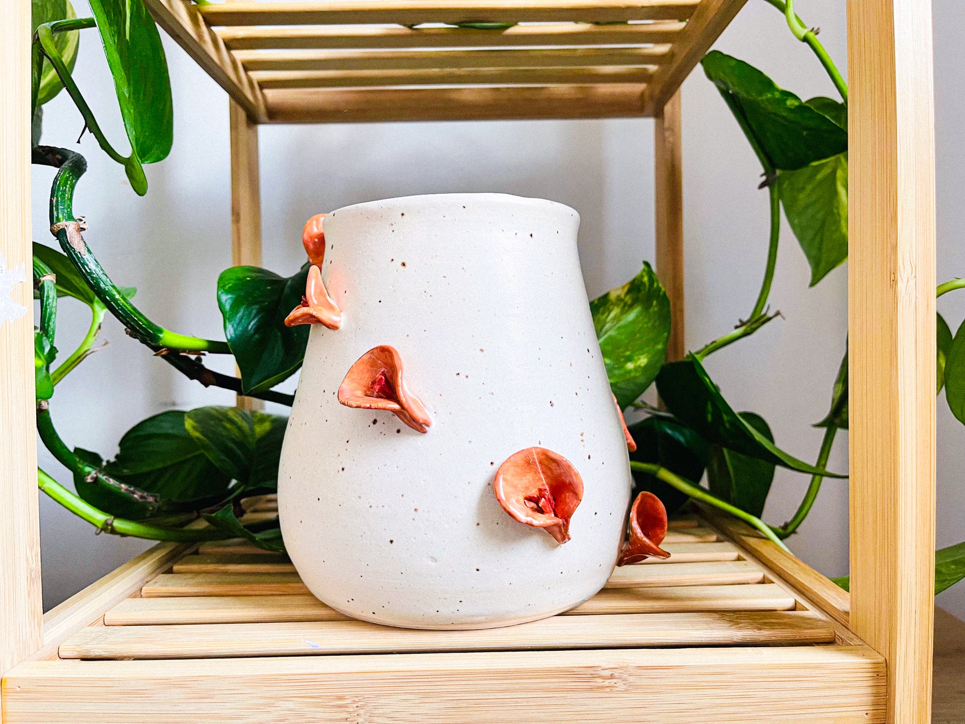 a large handthrown vessel, made on the potters wheel with white clay. this piece has been decorated with little handsculpted, handpainted lillies that climb around the outside, and finished with a speckled cream glaze.