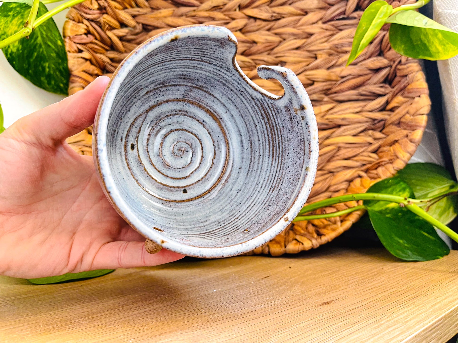 a stoneware bowl, wheel-thrown & hand-carved to serve the purpose of keeping your yarn tidy while it's in use! this cutie has been made with sandy stoneware clay & decorated with a purpley white glaze - reminiscent of frost. the bowl's sleepy face peeks out from an unglazed beating heart shape.