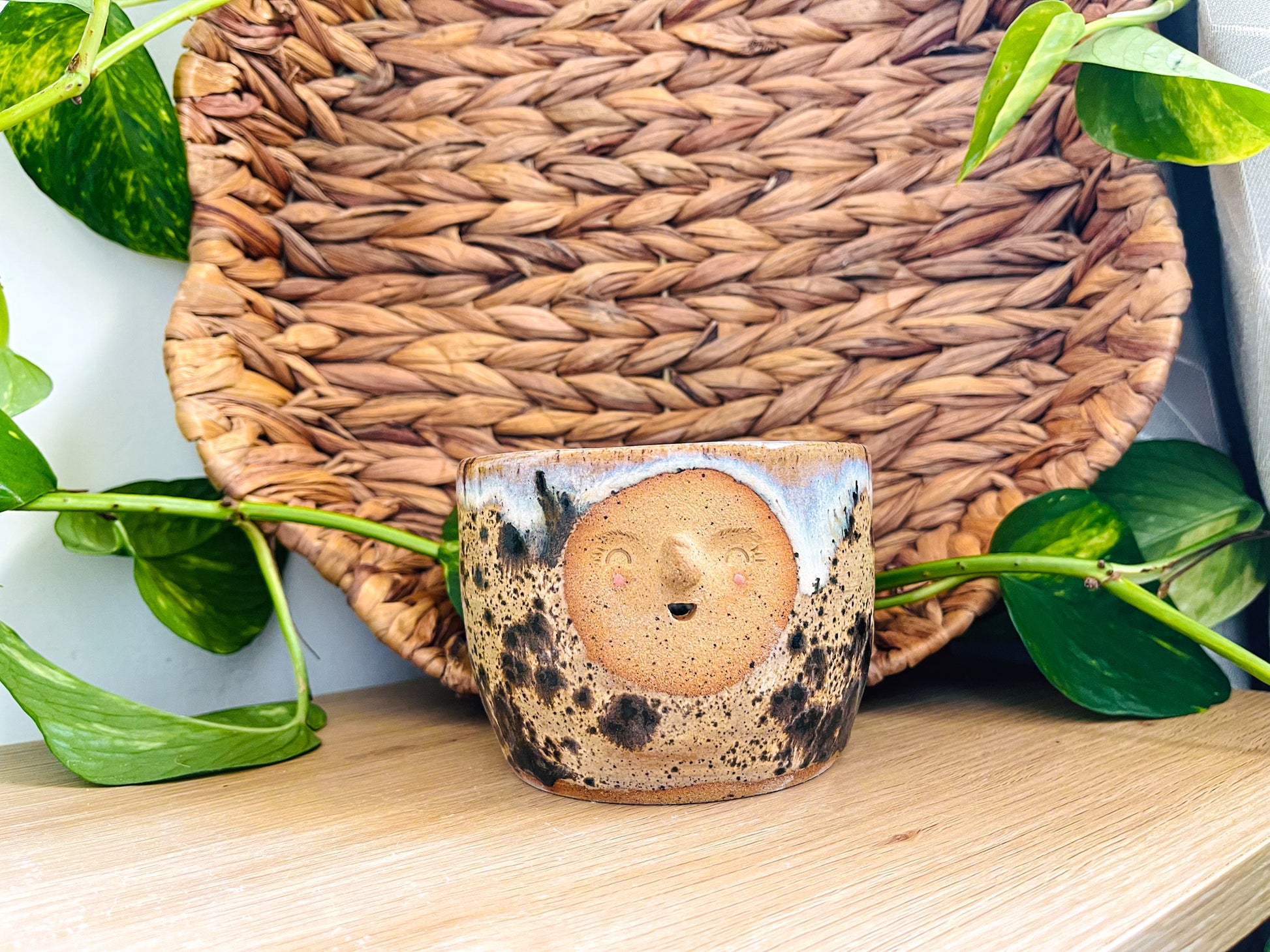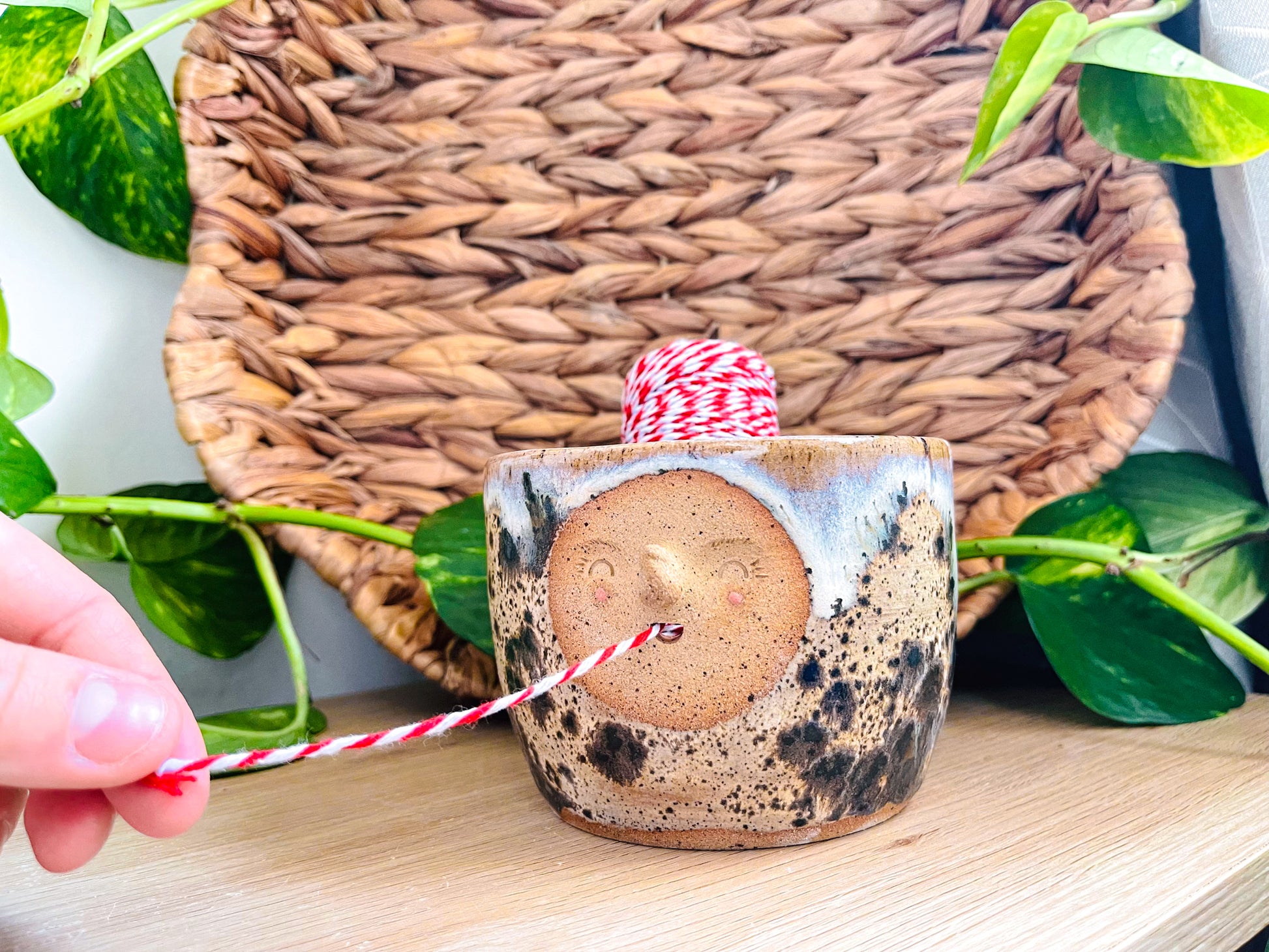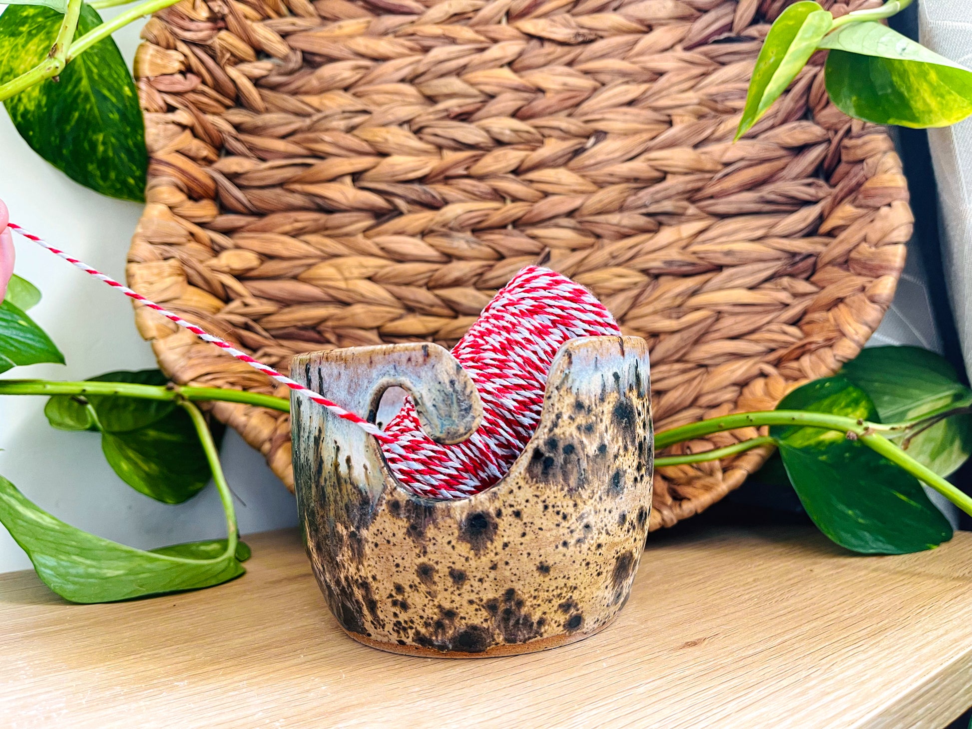 a stoneware bowl, wheel-thrown & hand-carved to serve the purpose of keeping your yarn tidy while it's in use! this cutie has been made with sandy stoneware clay & decorated with a sandstone glaze, layered with a little fluxing glaze on the rim. the bowl's sleepy little face peeks through an unglazed full moon shape.