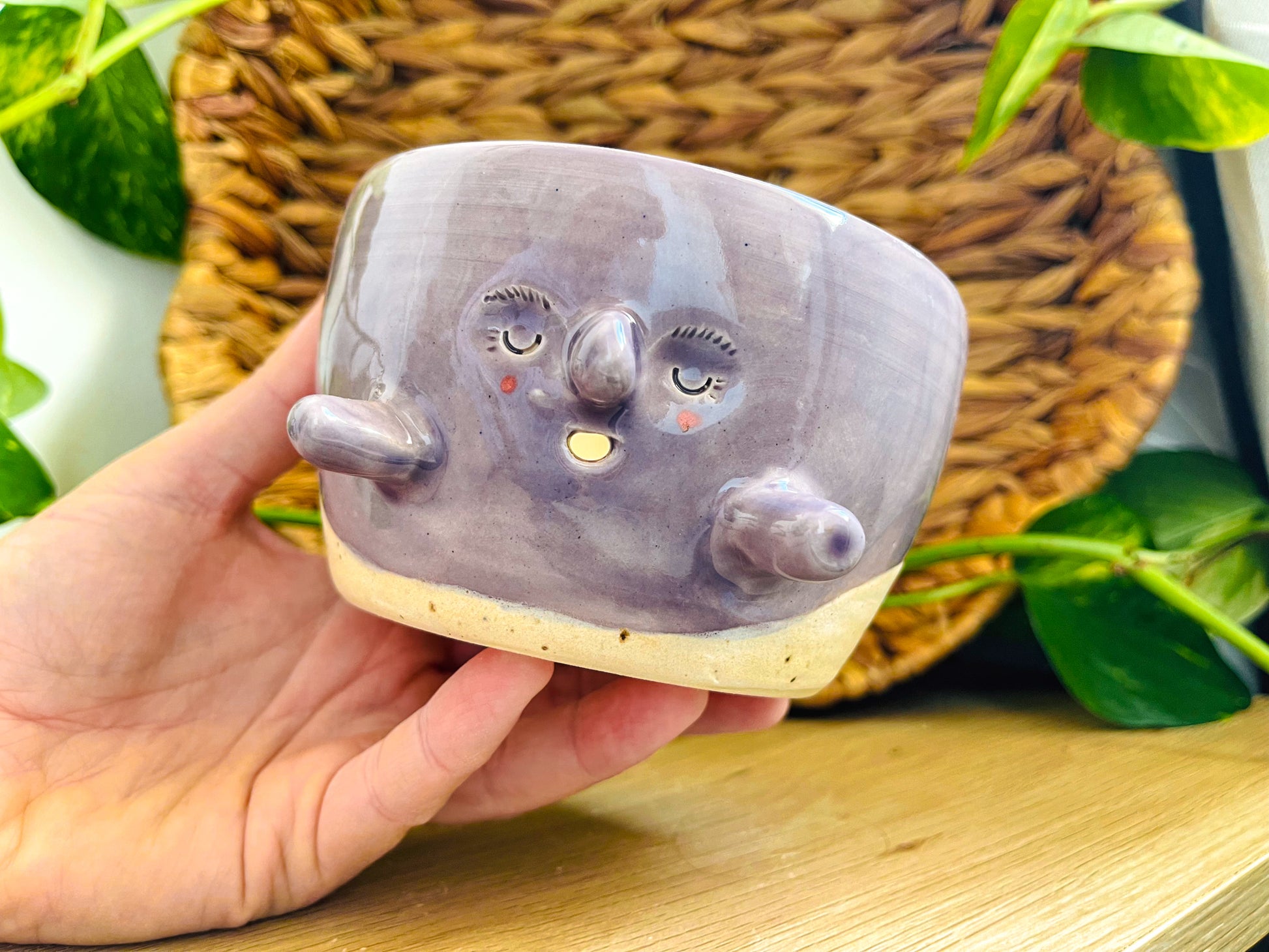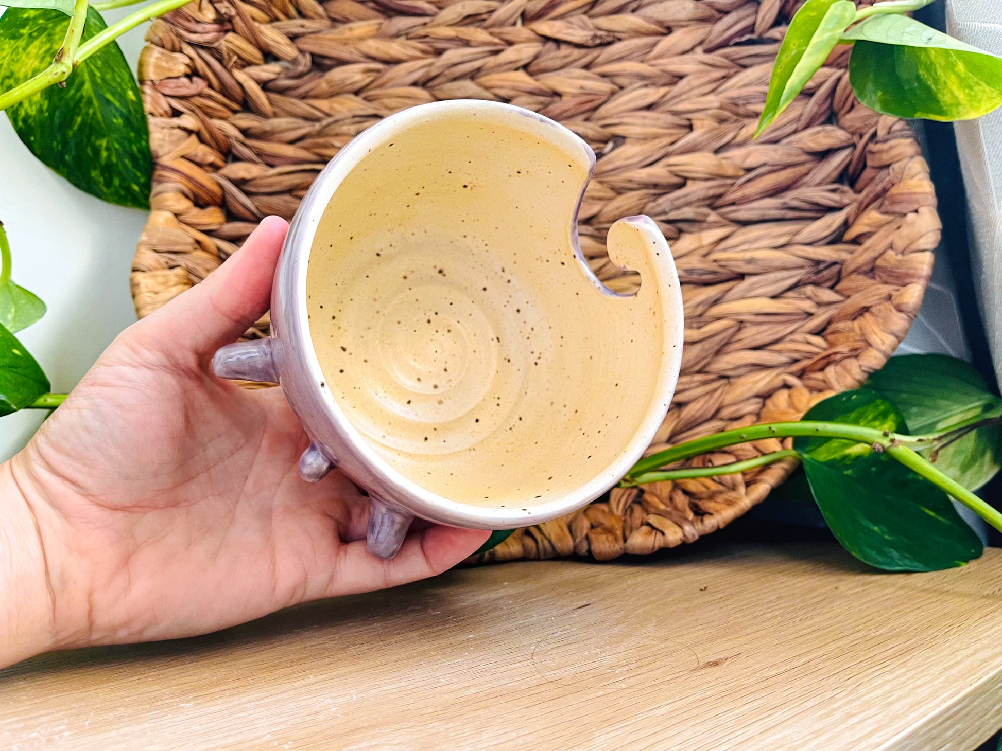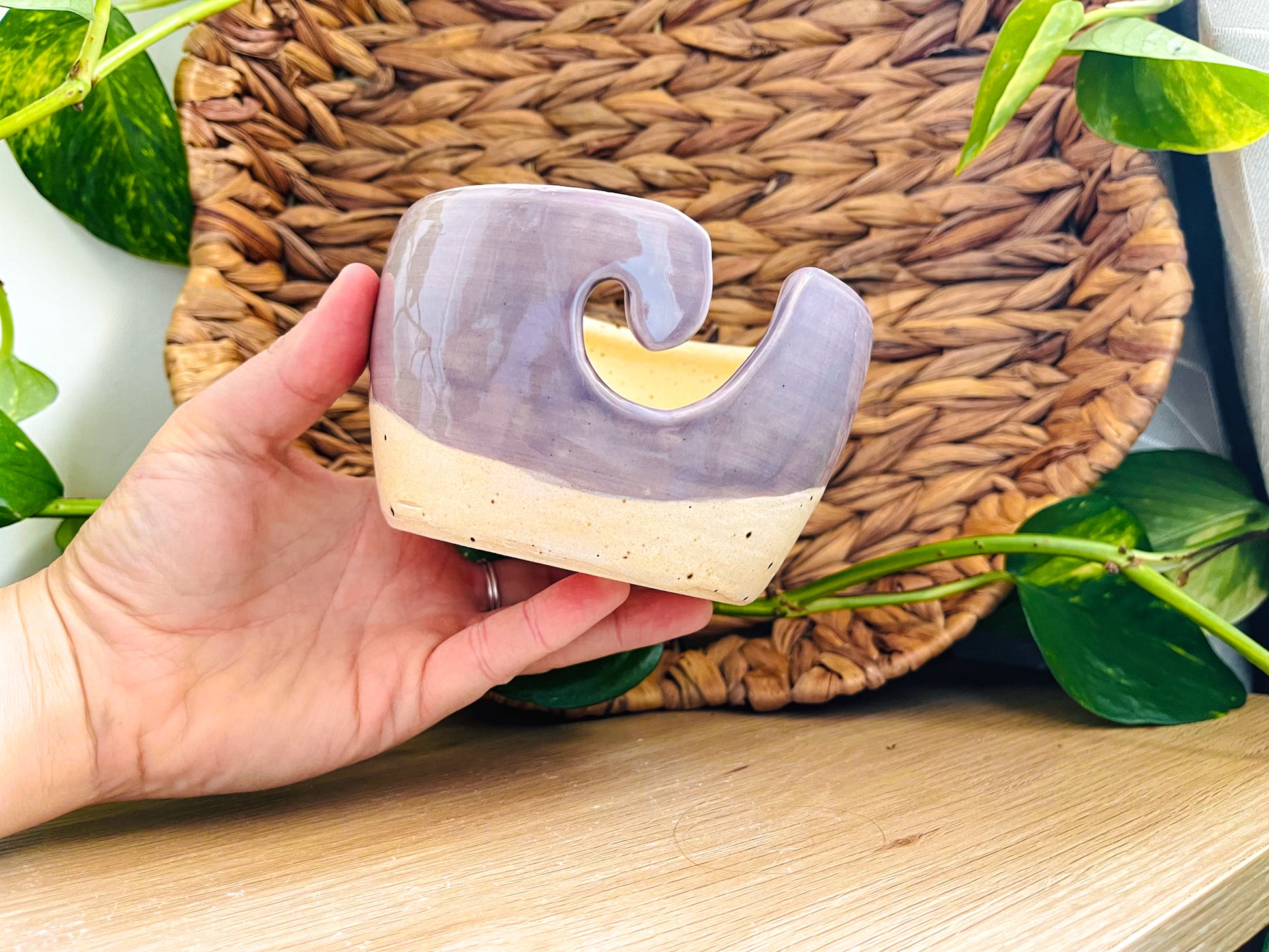 a stoneware bowl, wheel-thrown & hand-carved to serve the purpose of keeping your yarn tidy while it's in use! this cutie has been made with white stoneware clay & decorated with a split of speckled cream & glossy purple glazes.